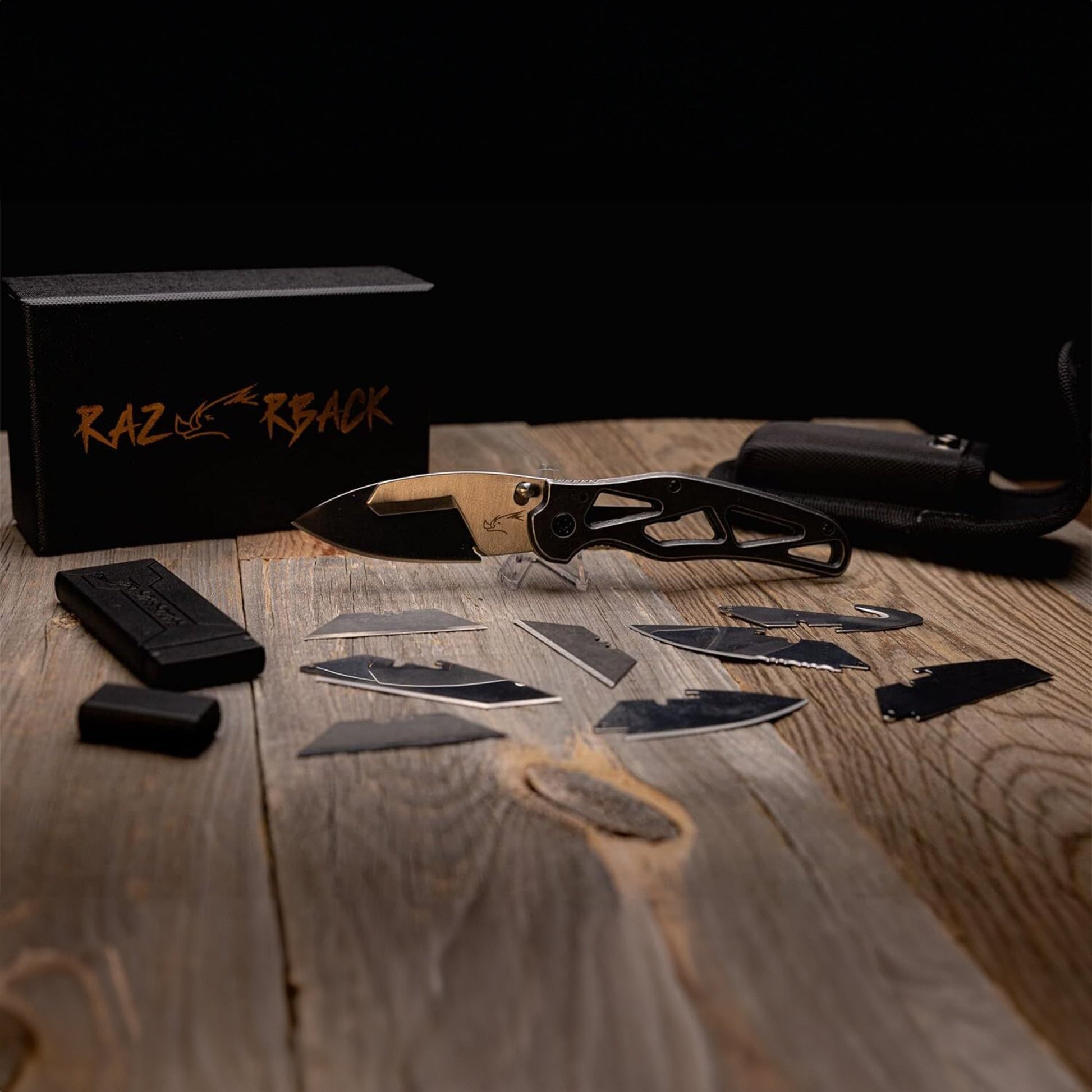 Every Razorback Signature Blade comes with a rugged Nylon Sheath that features an injection-molded case for carrying additional blade packs – The set also includes an extra storage box with 1 Drop Point Blade, 1 Seatbelt Cutter/Guthook Blade, and 3 Standard Utility Blades.